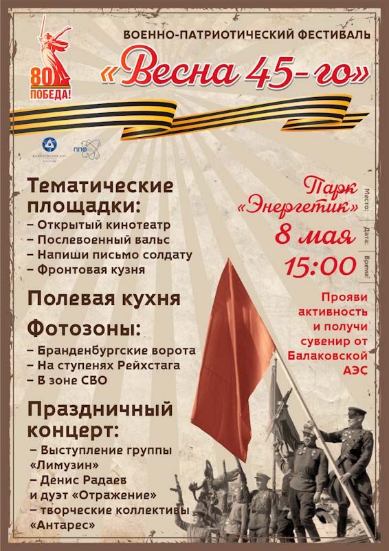 8 мая в 15:00 в парке «Энергетик» состоится военно-патриотический фестиваль «Весна 45-го», организованный Балаковской атомной станцией в преддверии Дня Победы.