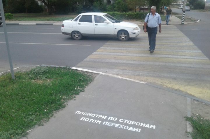 Так как летом на улицах города особенно много пешеходов, участники акции постарались призвать граждан быть бдительными. Через трафареты на асфальт были нанесены надписи “возьми ребёнка за руку” и “перед тем как перейти посмотри по сторонам”.