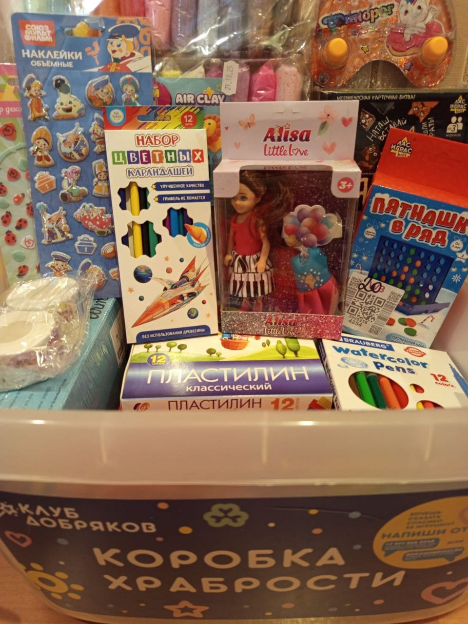 В коллекции подарков — яркие карандаши и краски, весёлые наклейки и раскраски, пластилин и увлекательные настольные игры, блокноты для творчества, маленькие игрушки и даже специальные наклейки для «паспортов храбрецов».