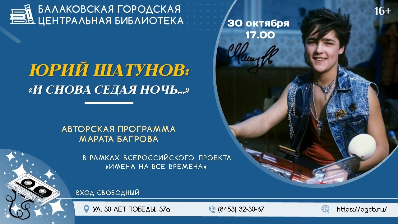 Афиша В Балаковской городской центральной библиотеке состоится авторская программа Марата Багрова «Юрий Шатунов: «И снова седая ночь…» 14.10.2025 10:10 4513