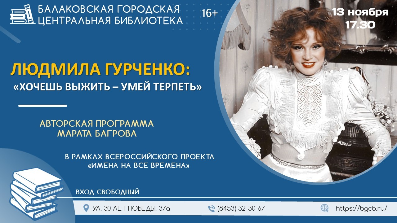 Афиша “Хочешь выжить – умей терпеть”. Завтра в Балаковской центральной библиотеке состоится вечер, посвященный Людмиле Гурченко 12.11.2025 09:52 2849