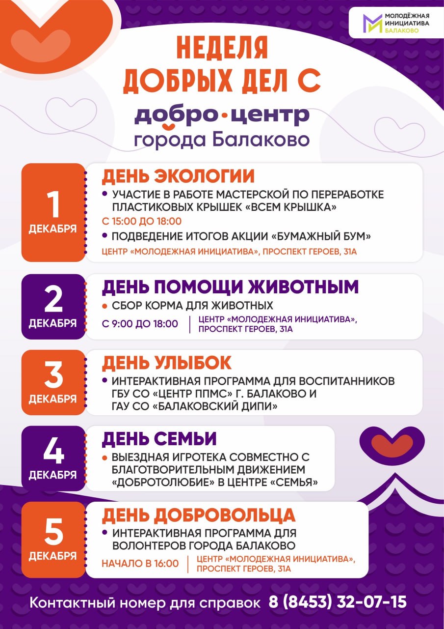 Афиша Неделя добрых дел в Балаково: программа мероприятий ко Всероссийскому Дню добровольца 25.11.2025 18:50 2695