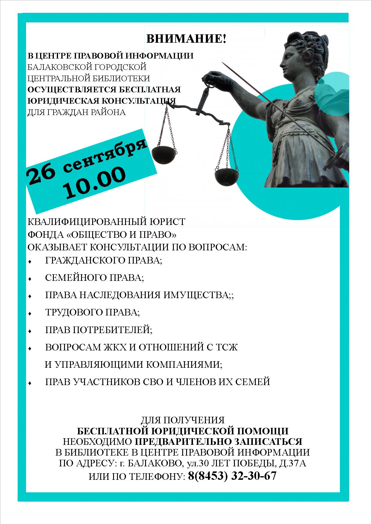 Новости Балаково В Центре правовой информации Балаковской городской центральной библиотеки балаковцы могут получить бесплатную юридическую консультацию 22.09.2025 15:17 4057