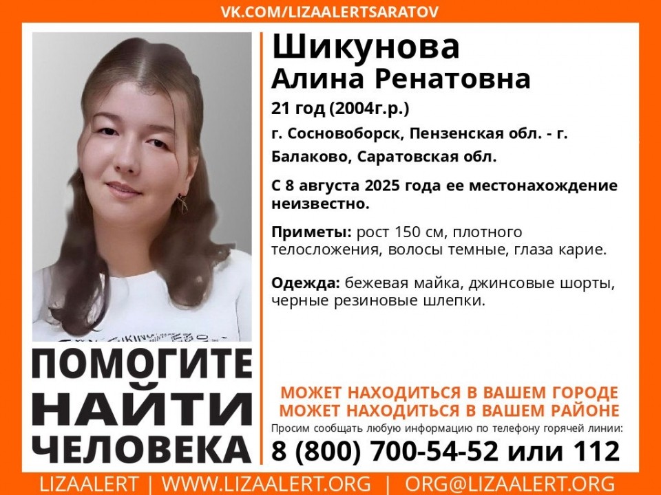 Новости Балаково Найдись, Алина! В нашем регионе разыскивают девушку родом из Сосновоборска 27.08.2025 11:21 4179