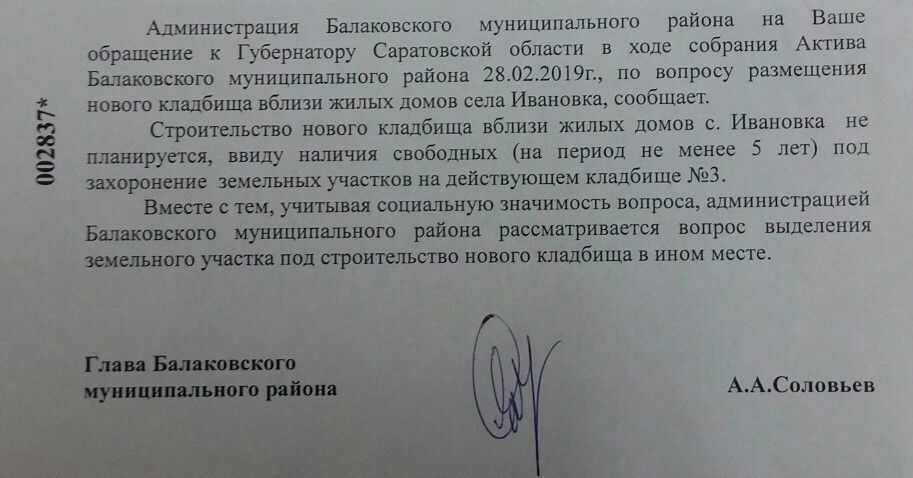 Новости Балаково Глава Балаковского района в официальном ответе местной жительнице написал, что мест на действующем кладбище в Ивановке хватит на 5 лет 02.04.2019 15:06 12351