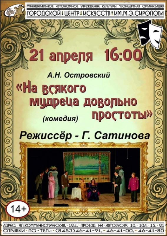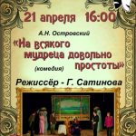 21 апреля в 16:00 в Городском центре искусств пройдет на спектакль «На всякого мудреца довольно простоты» народного театра «СаГа», режиссёр Галина Сатинова.