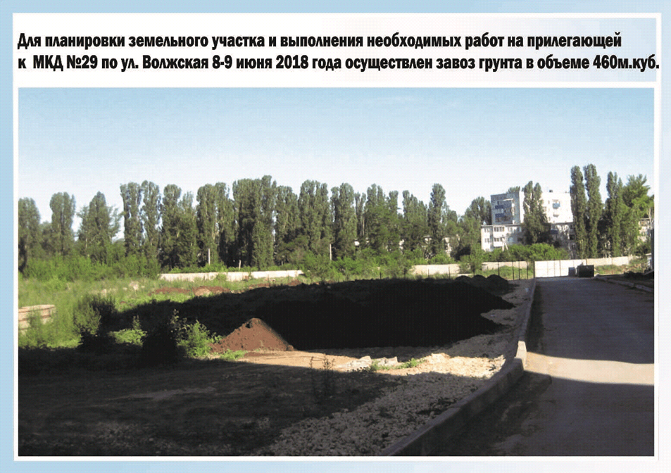 Администрацией Балаковского муниципального района организованы и проведены работы по благоустройству  придомовой территории МКД №29 по ул. Волжская (бывший стр. №5) 3г микрорайона – он сдан в эксплуатацию в декабре 2017 года. Для планировки земельного участка и выполнения  необходимых работ на прилегающей к многоквартирному дому  №29 по ул. Волжская 8-9 июня 2018 года осуществлен завоз грунта в объеме 460 м.куб.