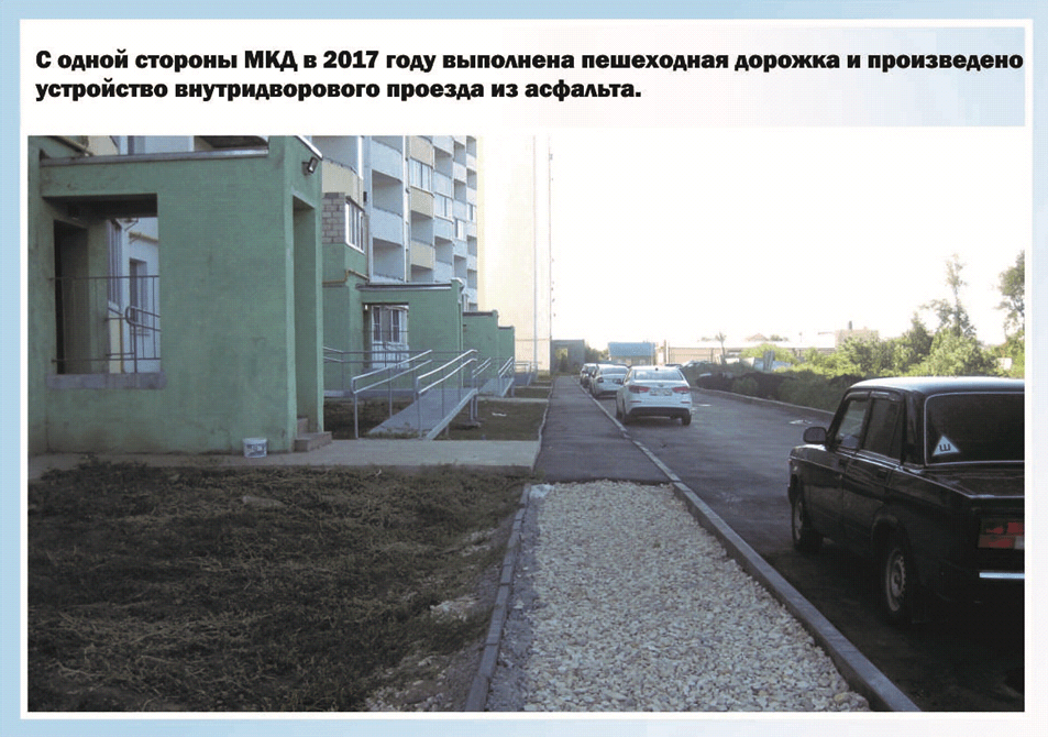 С одной стороны МКД  в  2017 году выполнена пешеходная дорожка и произведено устройство внутридворового проезда из асфальта. С  другой стороны – произведено устройство бордюрного камня и  отсыпка крупным щебнем.