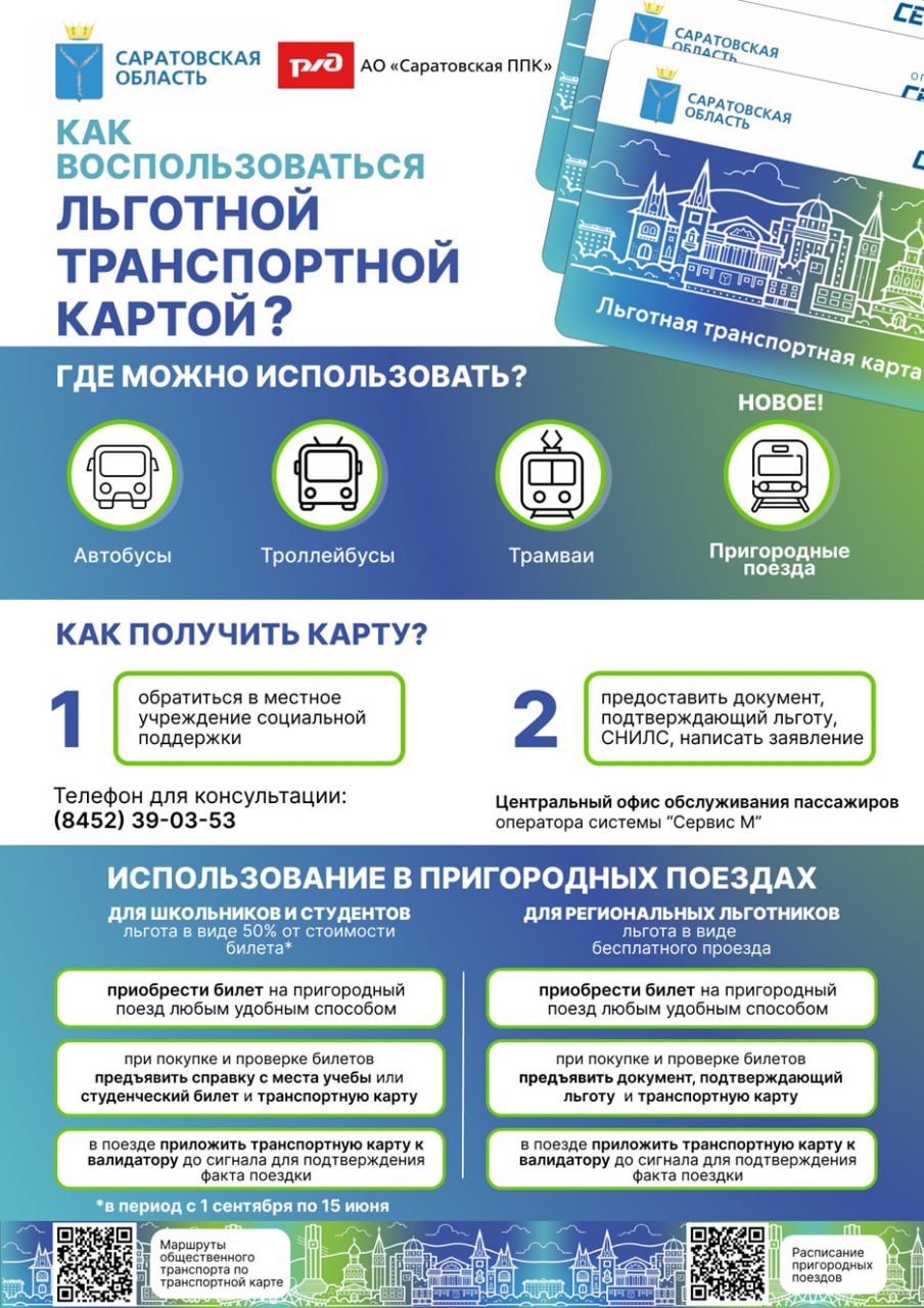 На основании Постановления Правительства Саратовской области от 28.10.2024 г. №885 «О внесении изменений в постановление Правительства Саратовской области от 30.12.2015 г. № 678П» с 01.01.2025 г.: бесплатный проезд для региональных льготников предоставляется при предъявлении: