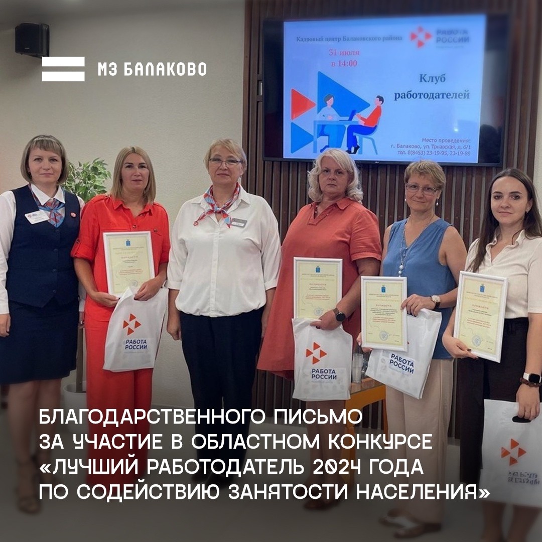 31 июля на заседании Клуба работодателей в Кадровом центре Балаковского района предприятие «МЗ Балаково» было удостоено благодарственного письма за участие в областном конкурсе «Лучший работодатель 2024 года по содействию занятости населения».