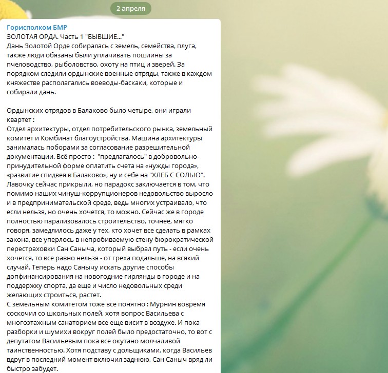 Сегодня в нашем обзоре Telegram-каналов мы снова уделим внимание новому каналу “Горисполком БМР”. В нем начали сливать интересные подробности о делах или делишках прошлой команды чиновников администрации Балаковского района. Такое обычно происходит, когда меняется власть. Но подробности такие занятные, что наверняка их решил выложить человек знающий, так сказать из самой системы. Не думаем, что это все было известно широкой общественности, иначе давно стало бы темой публикаций в СМИ или проверок правоохранительных органов…