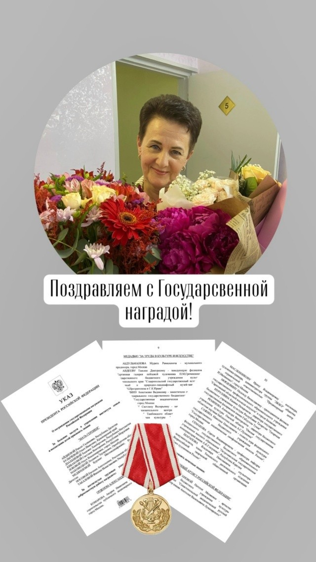За вклад в развитие отечественной культуры и искусства, многолетнюю плодотворную деятельность медалью «За труды в культуре и искусстве» награждены преподаватель Балаковского филиала «Саратовского областного колледжа искусств» Надежда Мордовина и артистка-вокалистка коллектива «Филармонические концертные исполнители» Саратовской областной филармонии им. А. Шнитке Ирина Левина.