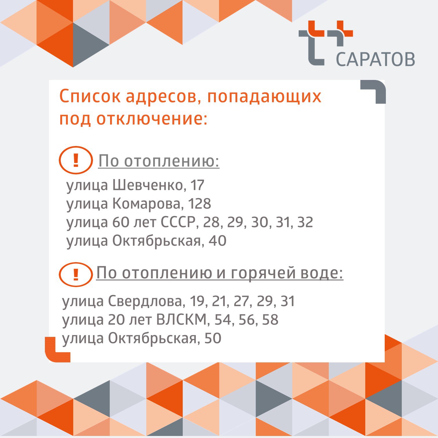 ПАО “Т Плюс” информирует балаковцев об очередном отключении отопления и горячей воды в некоторых многоквартирных домах: