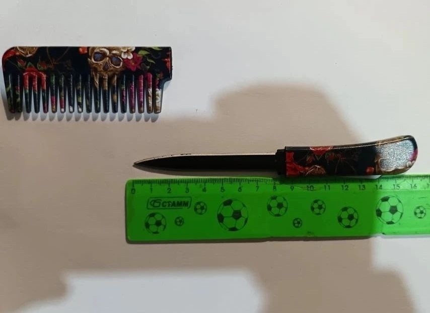 На первом посту судебный пристав попросил ее выложить все металлические предметы, после чего при осмотре сумки сработал ручной металлодетектор. При осмотре содержимого сумки был обнаружен нож – колюще-режущий предмет, искусно замаскированный под обычную расческу для волос. Длина лезвия ножа составила 8 см.