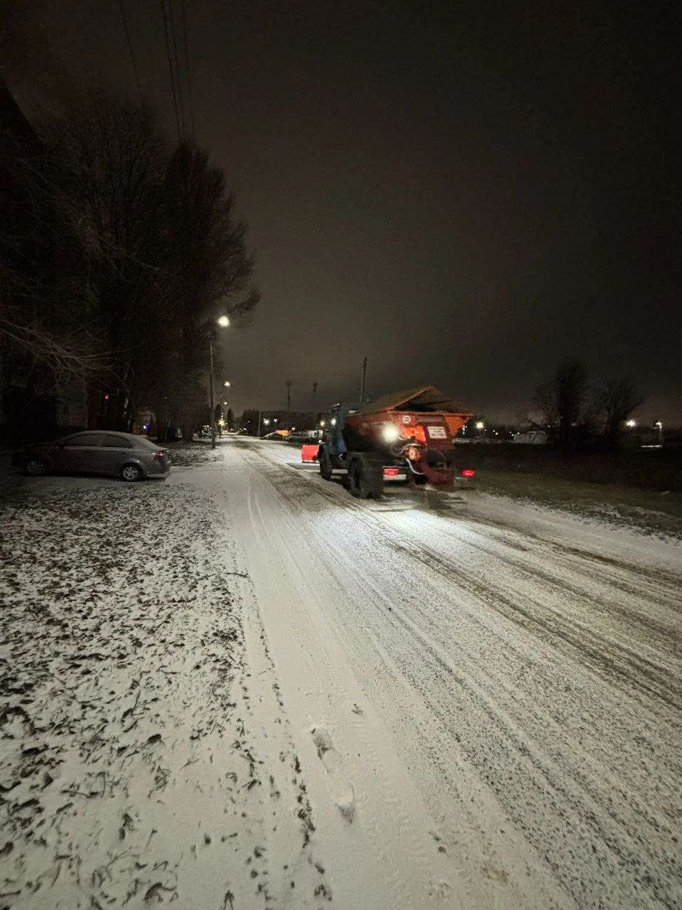 Снег выпал ночью, а с трёх часов утра во всех районах Балаково сотрудники Комбината благоустройства начали посыпать дороги пескосоляной смесью, чтобы предотвратить образование наледи.