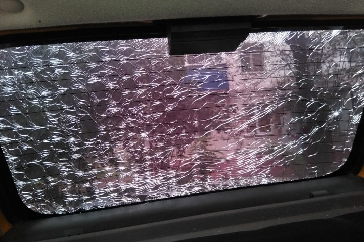 Расстреляли. Шарик от воздушки. Камень поопаснее будет. Детвора шалит.