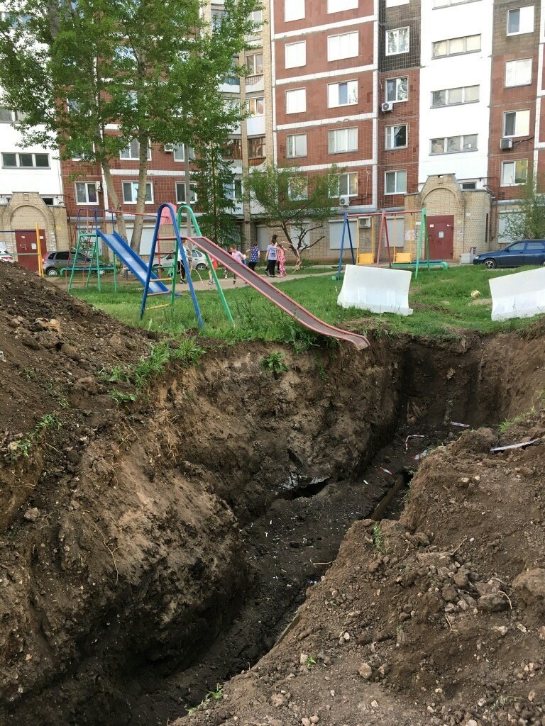 Жители города Балаково опубликовали в группе “Балаково и балаковцы” фотографии “суровой детской площадки”. В одном из дворов рядом с детской площадкой раскопали трубопровод. Спуск с горки теперь ведет прямо в яму. Горожане в комментариях шутят, что это суровая детская площадка и “дорожка в ад”. На фотографиях видно, что место раскопок оградили пластиковыми блоками, но один из них уже валяется в самой яме.