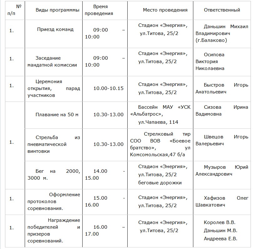 Фестиваль пройдет на трех площадках – стадионе «Энергия» (дисциплина «Бег»), МАУ УСК «Альбатрос» (дисциплина «Плавание») и СОО ВООВ «Боевое Братство» (дисциплина «Стрельба»).