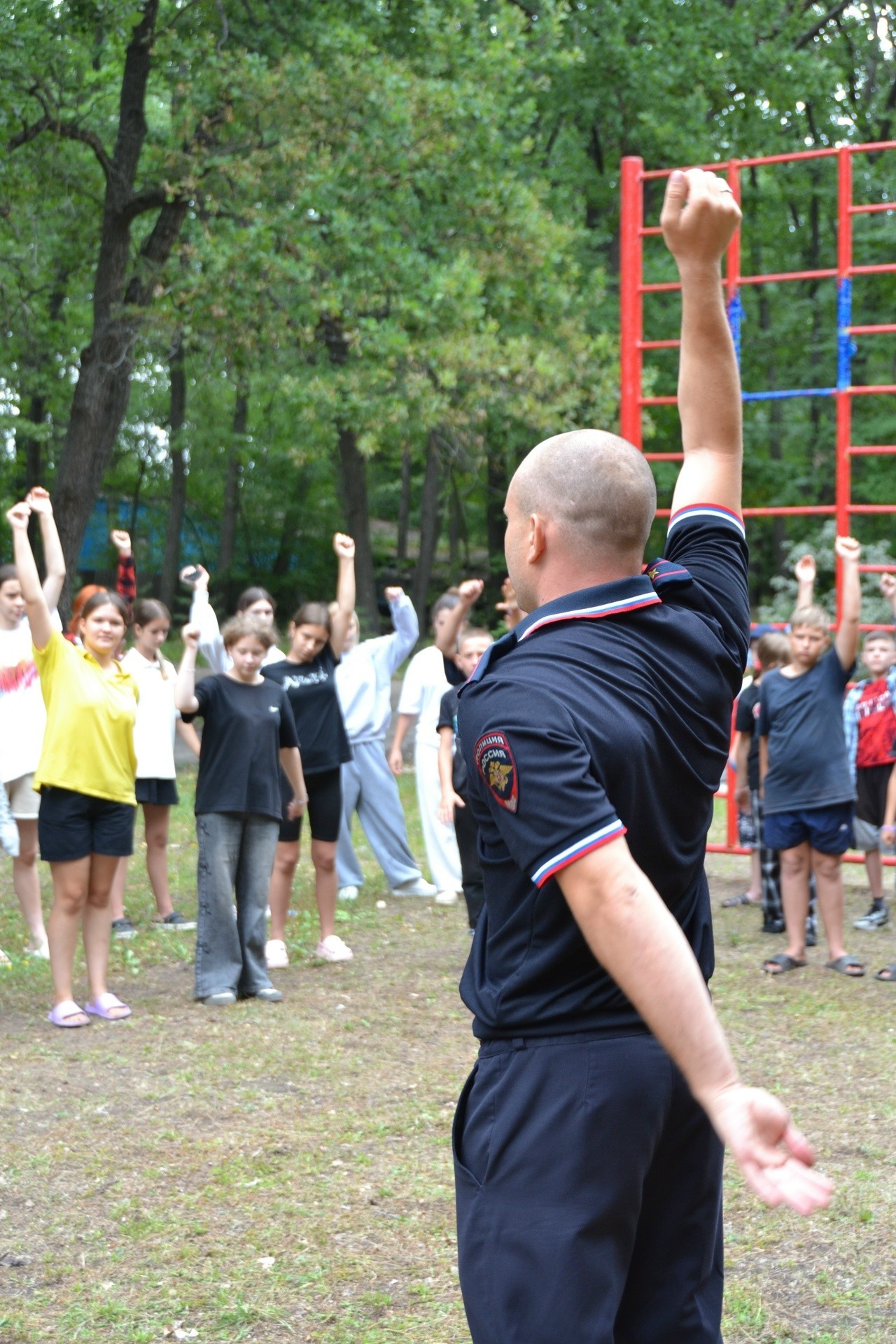 Зарядку с ребятами провел майор полиции Василий Давыдов, заместитель начальника Отдела полиции №5 в составе МУ МВД России “Балаковское”.